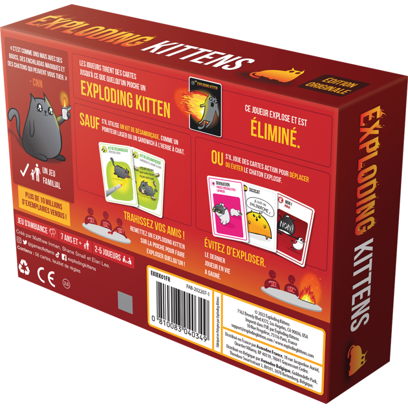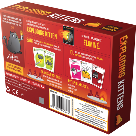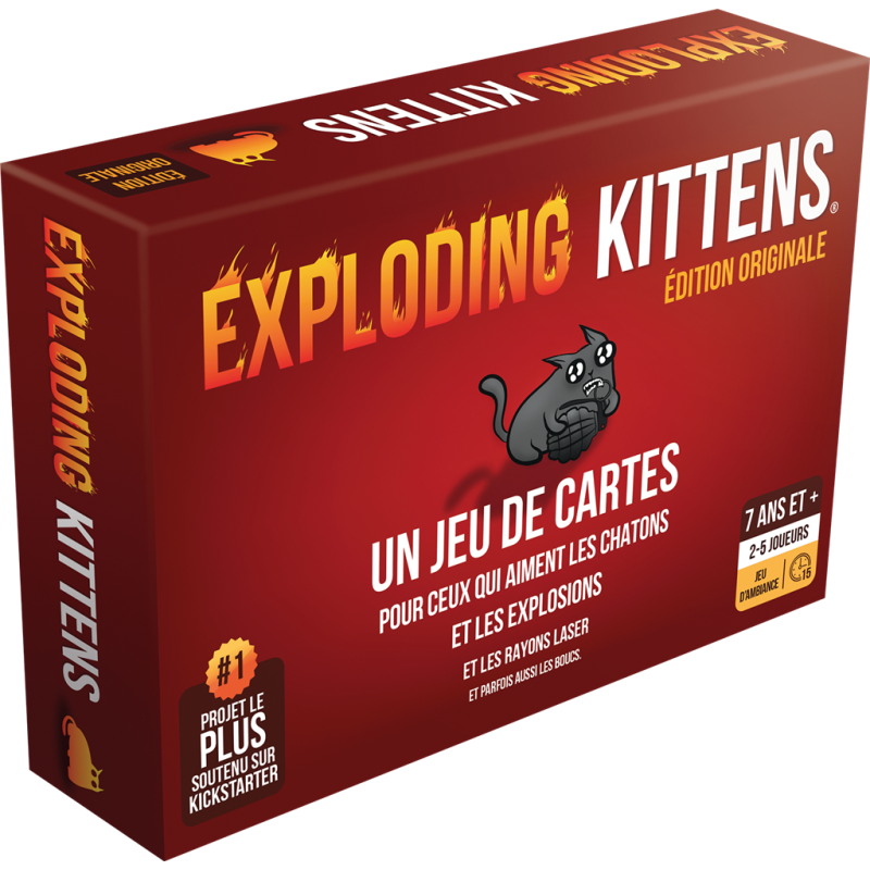Exploding Kittens revisite la célèbre Roulette Russe dans un jeu de cartes où les chatons côtoient d’un peu trop près grenades, missiles nucléaires et torpilles dans un cocktail détonant ! À tour de rôle, les joueurs piochent des cartes du paquet jusqu’à ce qu’un joueur révèle un chaton explosif, provoquant sa mort et sa défaite pour la partie en cours. Les autres cartes permettent aux joueurs de se protéger des déflagrations, de forcer les autres à piocher plus ou à regarder les prochaines cartes avant de remélanger le tout. Le joueur qui a réussi à éviter toutes les explosions remporte la partie !
