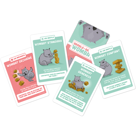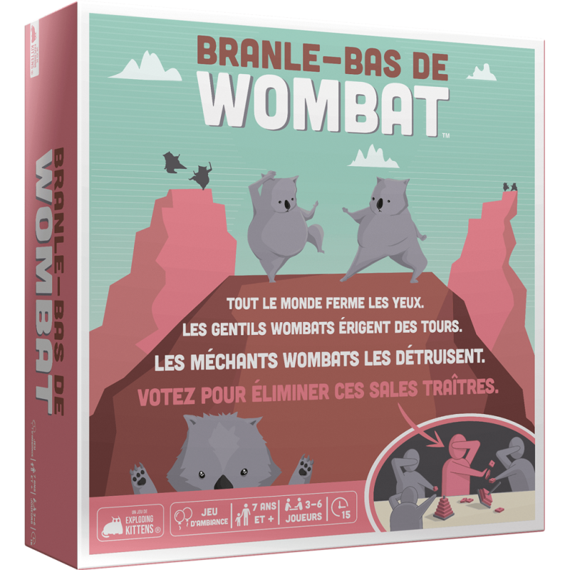 Dans Branle-Bas de wombat, chacun tire au sort une identité secrète de bon ou de mauvais wombat. Puis tout le monde ferme les yeux. Les gentils wombats construisent des tours, tandis les mauvais les en empêchent. Une fois le temps écoulé, tout le monde ouvre les yeux, on discute et on vote pour déterminer qui est un mauvais wombat.