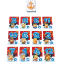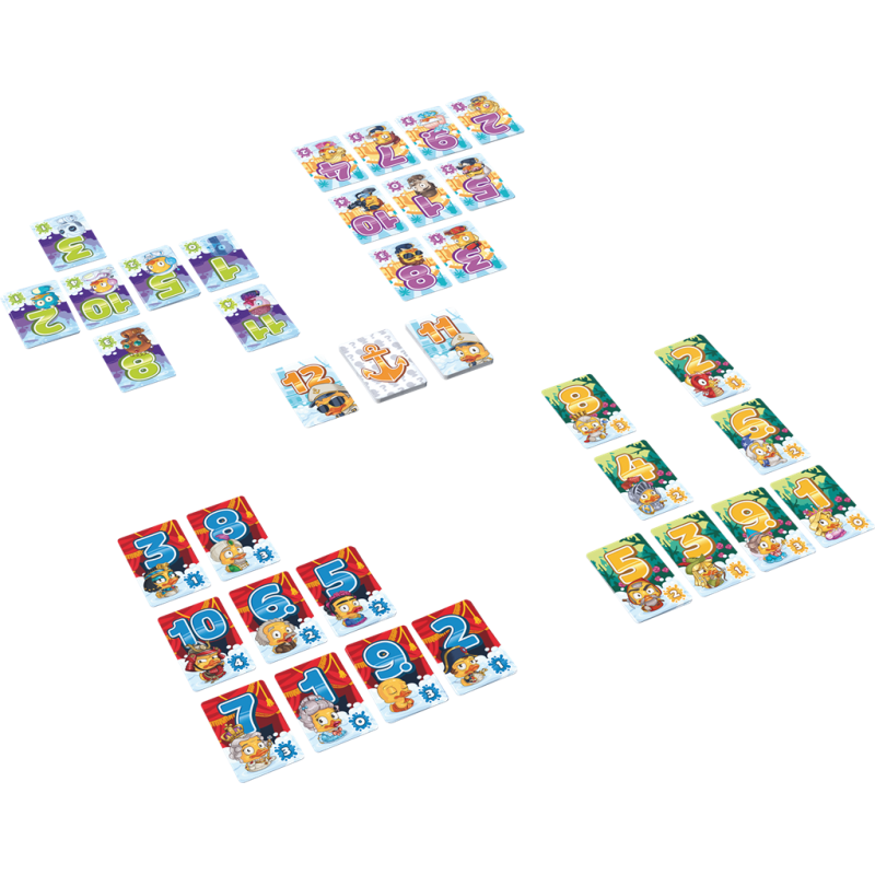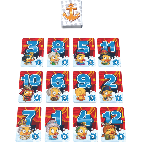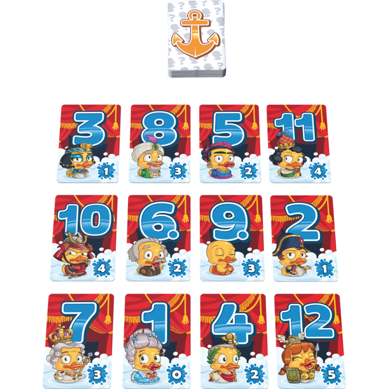 Chaque joueur reçoit une série de 12 cartes canard, portant un chiffre de 1 à 12, les mélange et les place devant lui, aléatoirement en une grille de 4 cartes sur 3.