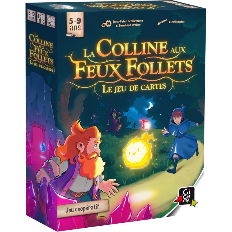 Dans La colline aux feux follets : le jeu de cartes, incarnez des Apprentis et suivez les feux follets pour rejoindre Jasper le Gnome qui souhaite vous offrir des cristaux magiques de sa mine. Mais les Sorcières veulent les récupérer avant vous !