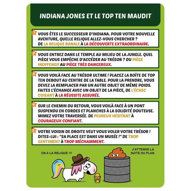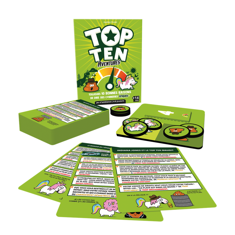 Avec Top Ten Aventures préparez-vous à vivre en équipe une aventure loufoque et hilarante. Dans ce jeu d’ambiance coopératif, une aventure sera choisie à chaque partie et les joueurs devront répondre aux 5 questions successives du thème, en inventant leur réponse selon un numéro secret de 1 à 10 selon une échelle qu'eux seuls connaissent.