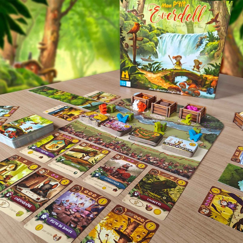 Rejoignez Chip, Sweep et les autres enfants d'Everdell pour construire la plus belle ville qui soit ! Ce jeu de placement d'ouvriers et de construction de tableaux, facile à apprendre, amusera toute la famille tout en faisant travailler les méninges des petits, en améliorant leur concentration et en renforçant leurs capacités d'apprentissage. Grimpez sur le pont de corde, faites attention à la tanière du dragon et rejoignez-nous dans le fort pour le dernier né de la gamme Everdell, Mon p'tit Everdell.