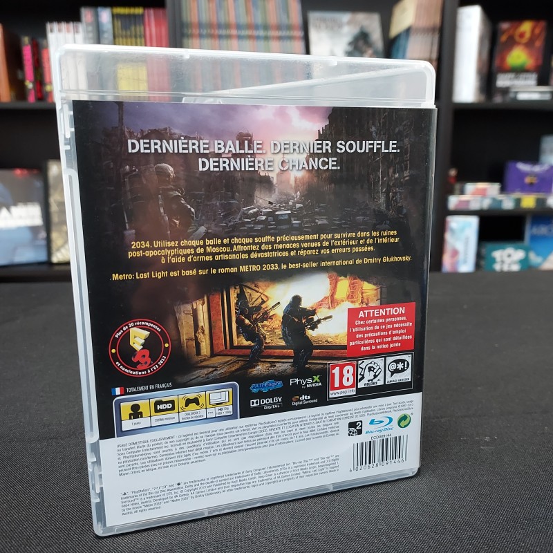 Metro : Last Light est un FPS sur PS3 qui plonge le joueur dans un futur post apocalyptique. Les survivants y vivent dans le métro moscovite et s'affrontent pour les ressources restantes tout en luttant contre les mutants venus de la surface. Artyom, le héros, doit alors empêcher une guerre et réconcilier les êtres.