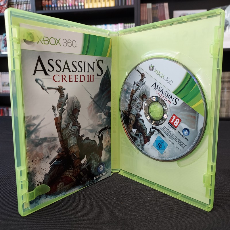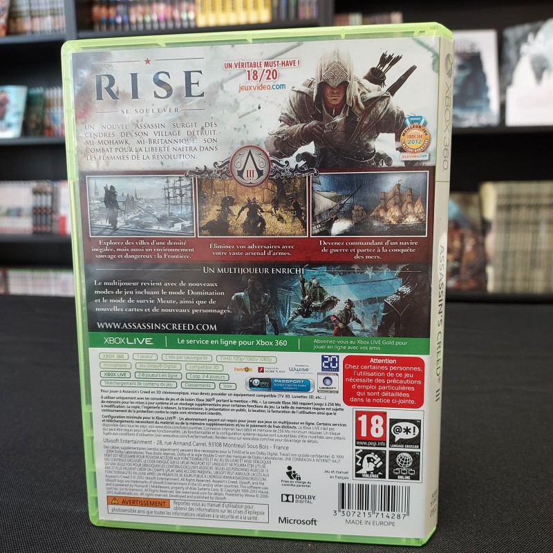 Assassin's Creed III est un jeu d'action-aventure sur Xbox 360. Desmond essaye de prévenir une éruption solaire destructrice malgré l'éternel conflit entre Assassins et Templiers. Via l'animus, il se plonge en pleine révolution américaine sous les traits d'un de ses ancêtres aux origines anglaises et amérindiennes : Connor Kenway. Armé d'un Tomahawk, le joueur explore Boston et New-York en bénéficiant d'une météo dynamique.